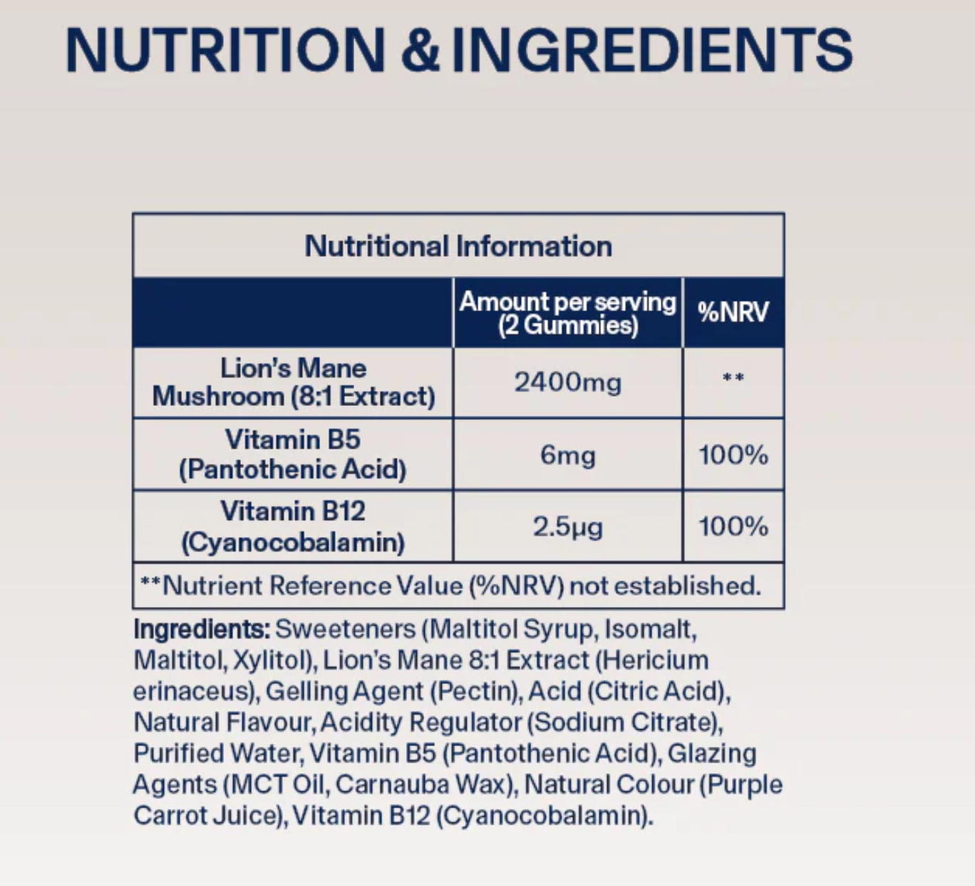 Apple-flavoured gummies with Lion's Mane mushroom extract, Vitamin B5 and B12.